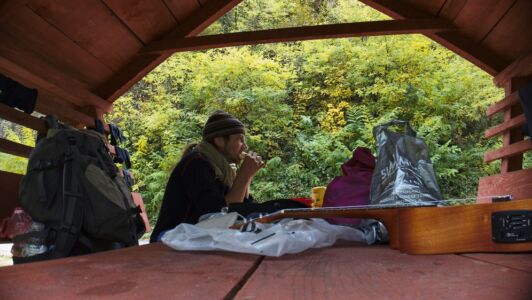 J’ai planté ma tente à côté d’un parking qui a semblé, pendant tout la nuit, être le lieu d’un important trafic de troncs d’arbres. Sachant que les traficants de troncs d’arbres sont vraiment les plus dangereux, je ne me sentais pas rassuré du tout…