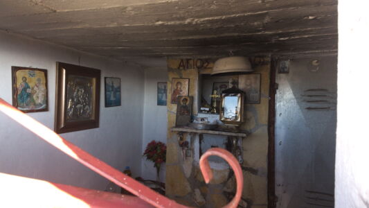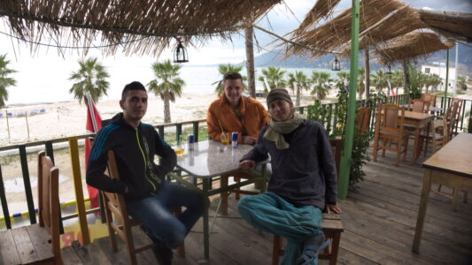 S’arrêter le soir près d’un cimetière… c’est très bien pour rencontrer des gens. Une vieille dame rencontrée là m’a conduit jusqu’à une école fermée, où j’ai pu m’installer pour la nuit sous le perron de la porte d’entrée. Elle m’a offert du pain et des olives, en m’assurant qu’il n’y avait pas de problème pour que je dorme ici. Le lendemain matin, j’ai fait la rencontre de trois enseignants surpris.